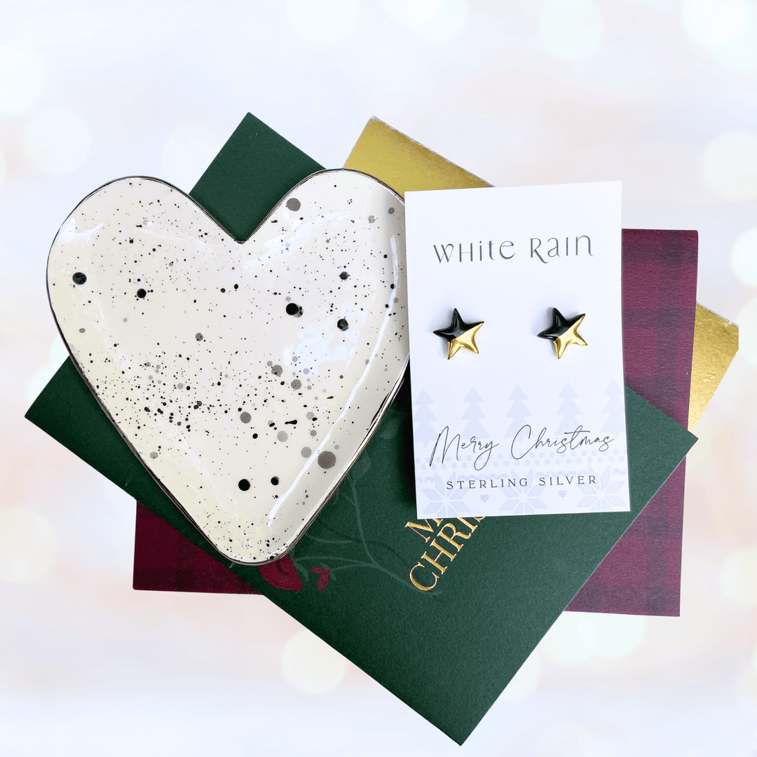 Spotty heart trinket dish and stud earrings on a Merry Christmas Card