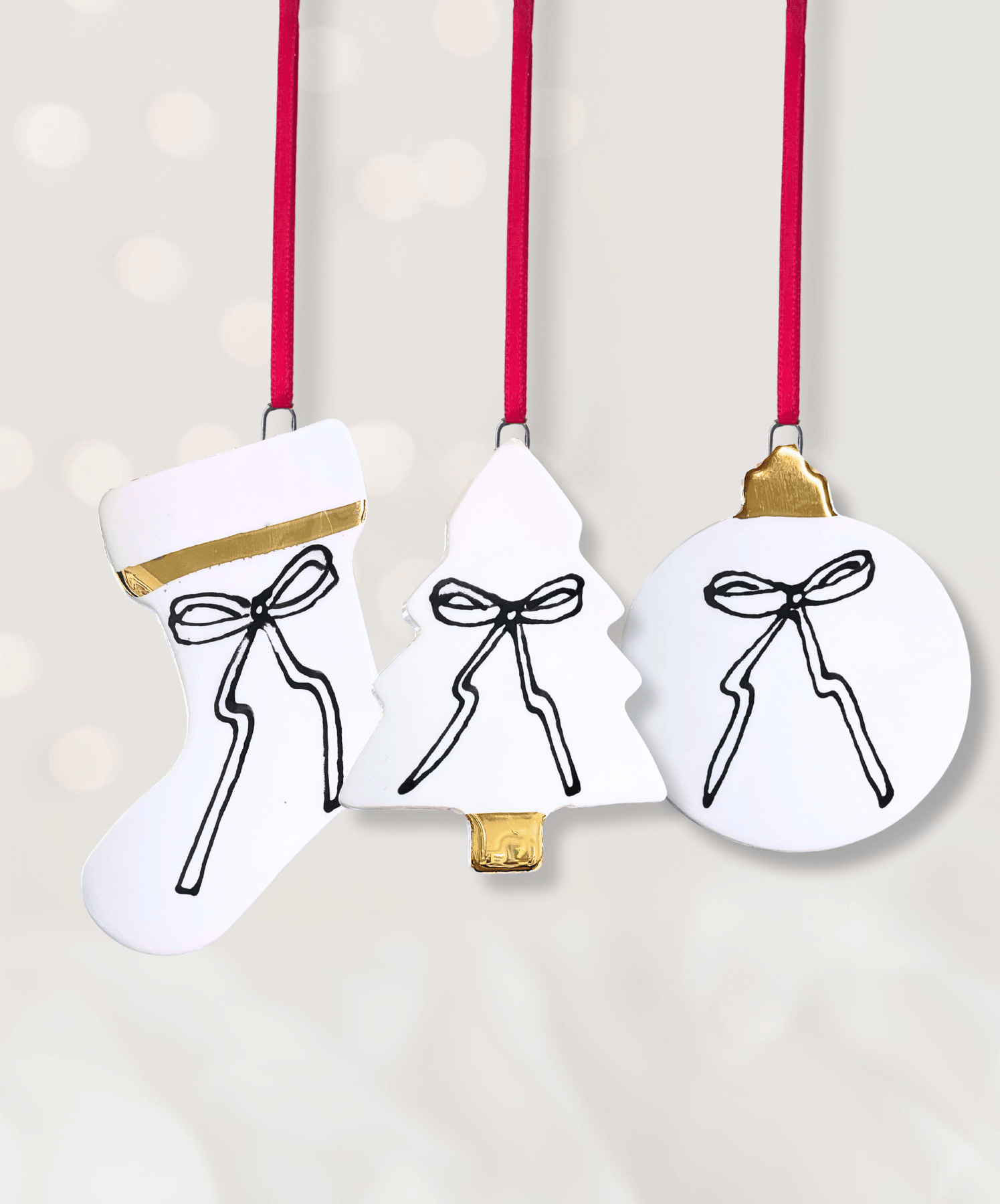 Our new Stripe decorations are Here!  Ceramic ornaments in a christmas tree, stocking and bauble shape with a hand painted black ribbon