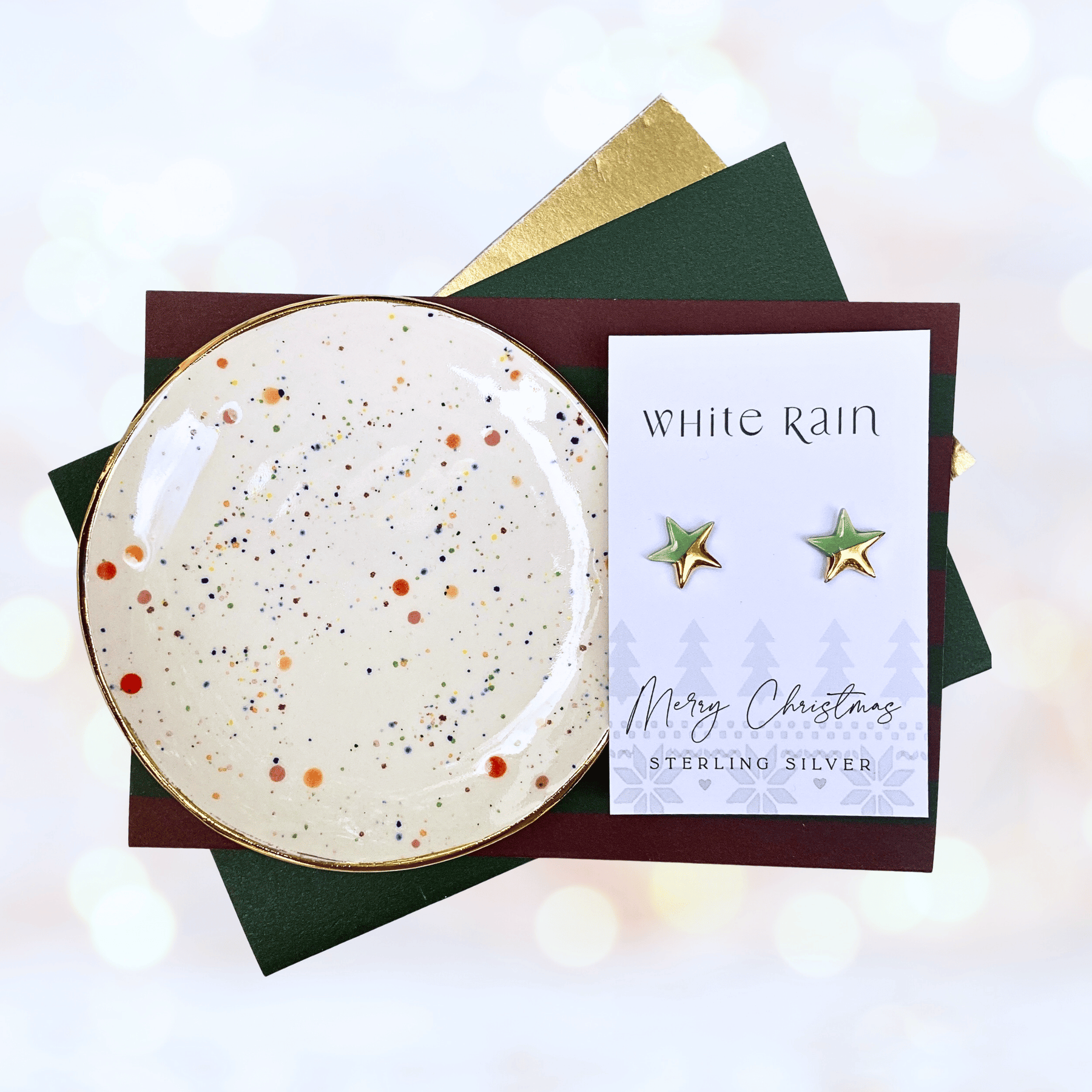 Bring a little Christmas magic to someone special with this handmade gift set, featuring a trinket dish with our popular colourful spotty design and a choice of our bestselling stud earrings displayed on a festive “Merry Christmas” card.
