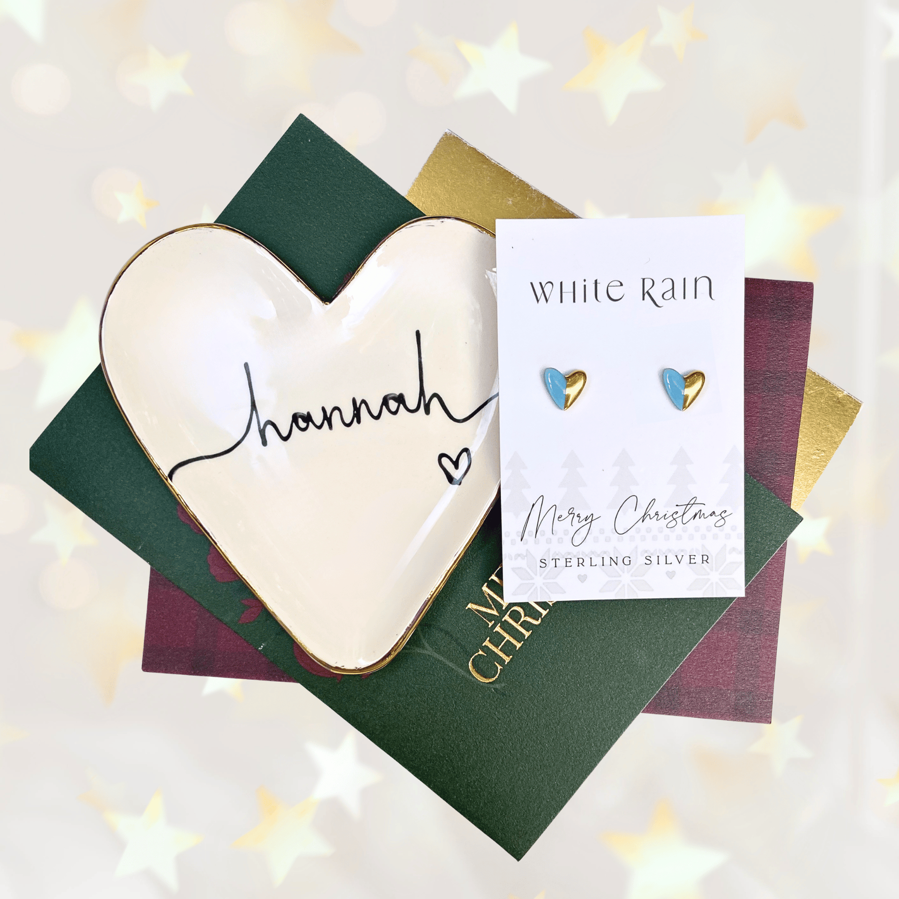Personalised heart trinket dish and stud earrings on a Merry Christmas Card