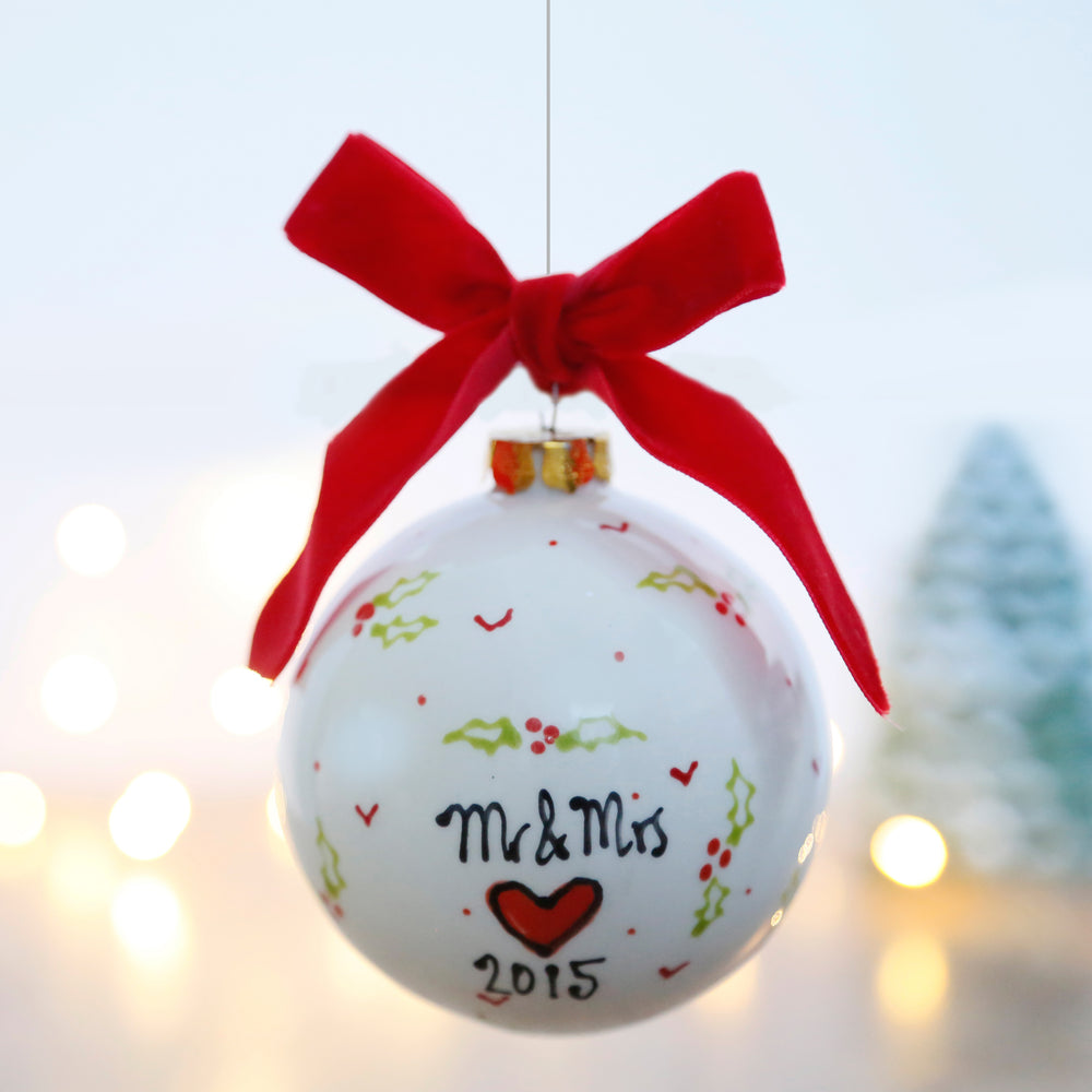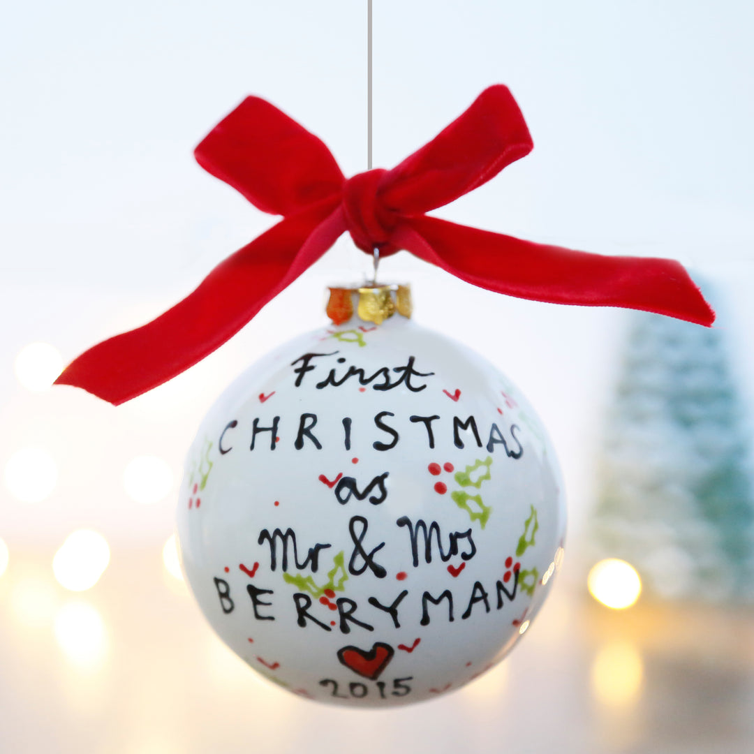 Personalised First Christmas as Mr and Mrs Ceramic Bauble with Holly and Hearts